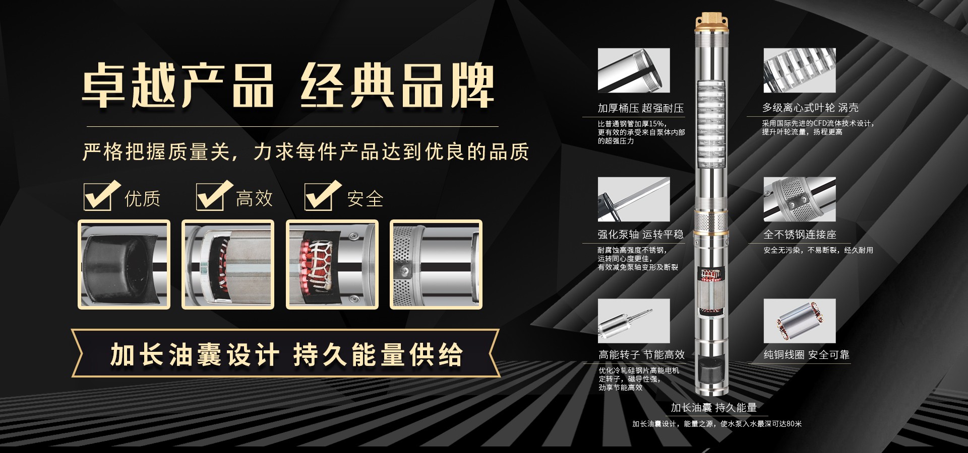 不僅僅是泵,更是流動(dòng)的科技。十多年來(lái),本公司堅(jiān)持走:以質(zhì)量求生存以科技創(chuàng)新求發(fā)展,重合同守信用的道路,生產(chǎn)經(jīng)營(yíng)得到迅速發(fā)展。更希望以后不管從發(fā)達(dá)城市到新農(nóng)村,從工業(yè)制造到尖端科技產(chǎn)業(yè)都隨處可見(jiàn)創(chuàng)江井泵的身影,創(chuàng)江深井泵已成為干萬(wàn)用戶心目中優(yōu)質(zhì)和信心的保證我們將以?xún)?yōu)質(zhì)的產(chǎn)品和最完善的售后服務(wù)來(lái)真誠(chéng)與各界朋友開(kāi)展廣泛的合作,共同創(chuàng)造一個(gè)美好的未來(lái)!